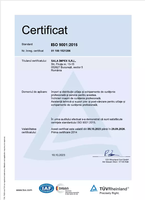 Produsele si soluțiile noastre sunt in deplina concordanta cu standardele UE privind cerintele de Protectie a Mediului si mentinerea calitatii acestuia. SALA Group detine certificarile de calitate pentru a desfasura activitatile la cele mai inalte standarde din industrie si, la randul sau, le asigura clientilor sai certificate de garantie, pentru produse si echipamente de curatenie profesionala.
